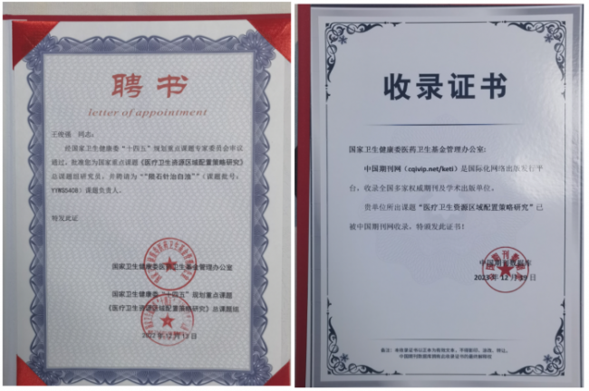 《陨石针治白浊》项目(课题立项批准号:YYWS5408)作为国家卫生健康委“十四五”规划全国重点课题《医疗卫生资源区域配置策略研究》的子课题,经课题专家组鉴定,顺利通过结题验收。并通过专家组从科学性、规范性、创新性和应用价值等方面进行评审,获得科研成果一等奖。