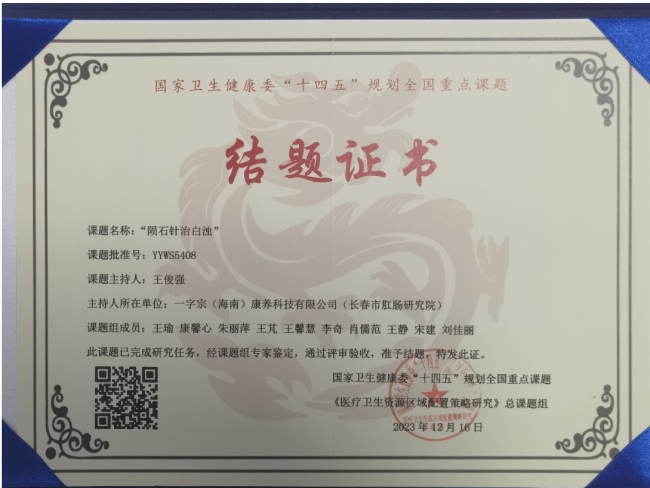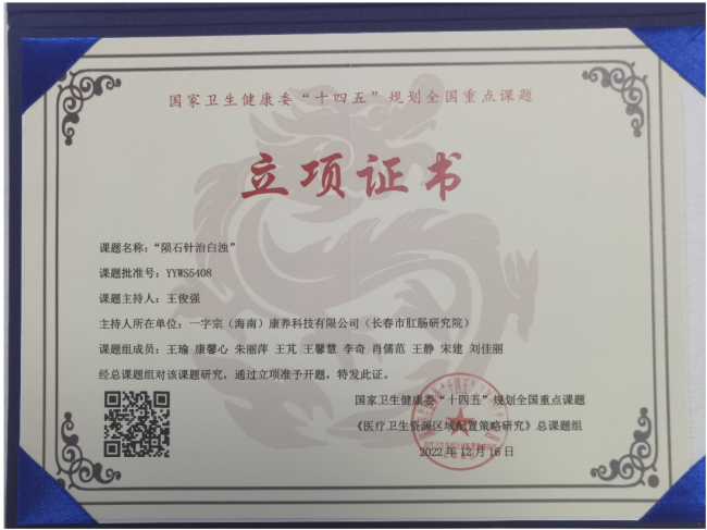 近期,由一字宗(海南)康养科技有限公司(原)海南一字宗康养科技有限公司(长春市肛肠研究院)主持的《陨石针治白浊》项目,获得国家卫生健康委“十四五”规划全国重点课题立项证书。