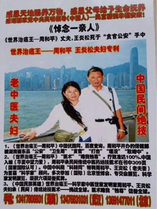 周和平、王炎松夫妇来自中医世家,是科学界杰出的发明家,医术达到了国家领先水平,先后荣获八项中医奖牌、证书。周和平介绍,她的医术属于中医全科:不吃药、不注射、不开刀、不化疗、不放疗,就在皮肤穴位上通过使用竹子加蒸汽以及中医针灸的方式,再辅佐以祖传秘方,就能根治各类晚期恶性肿瘤,以及癌症等疑难杂症。治愈后不复发,疗效可达 100%。而且在整个治疗过程中能够实现内病外治、有利无害,相关医术已达国际领先、世界先进水平。