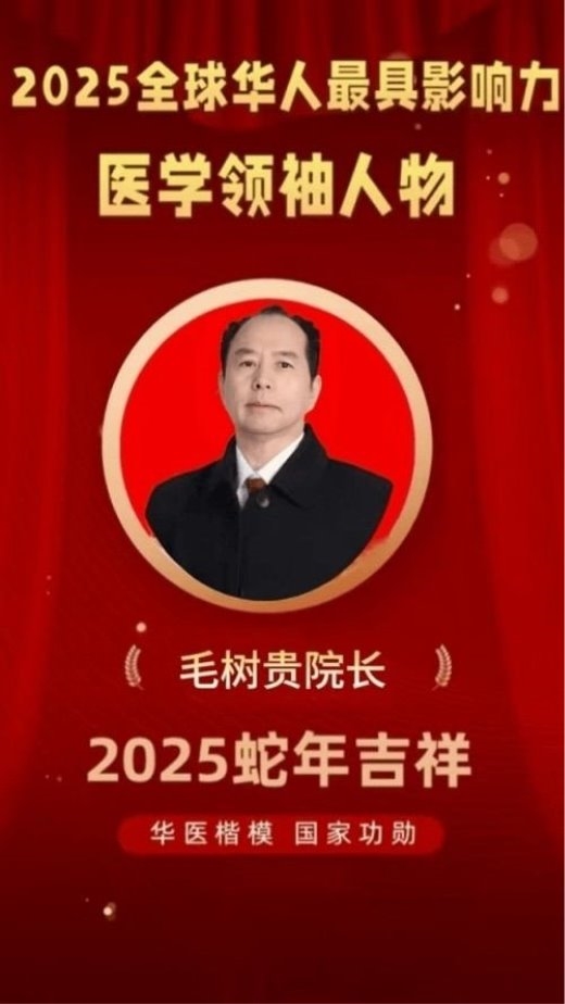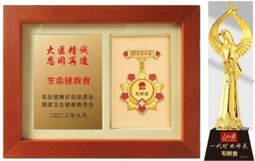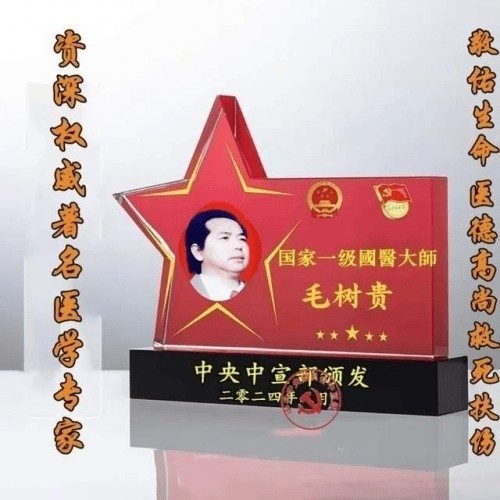 国家功勋,旷世神医。国家一级国医大师。主任医师、教授、国医泰斗兼中医行业主席、博导、国家中医药战略科学家,国医大师功勋人物、旷世神医、中医泰斗、国宝级中医。北京玉天阁医学研究院院长,中华医学临床研究医学会副会长,国际特效名中医专家协会理事长,C..全国行业管理督察长。“十四五”国家中医药杰出人才——战略科学家。《人民日报,中 央热点观察,新华网中华英才、中国新闻联播、CCTV央媒头条、中国教育、中 央新闻两会专栏,党 政新闻网,政 治新闻网:国家中医药战略科学家·中医泰斗国医大师功勋人物——救世活人毛树贵》……。