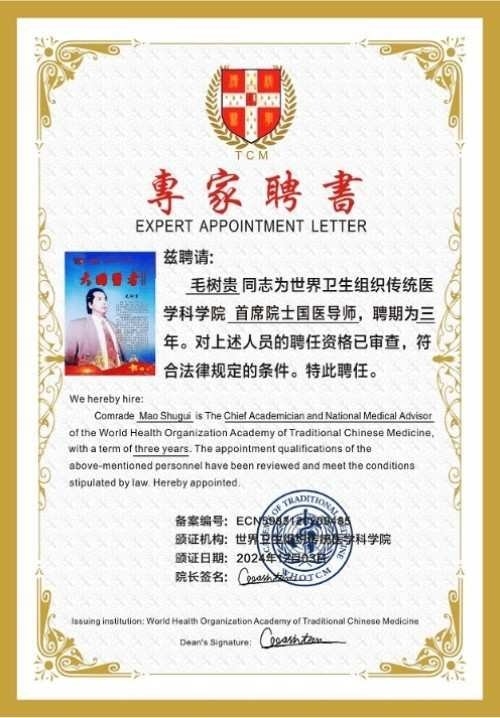 Mao Shugui currently serves as: Chief Academician of the World Health Organization Academy of Traditional Medicine Sciences; National Medical Mentor.