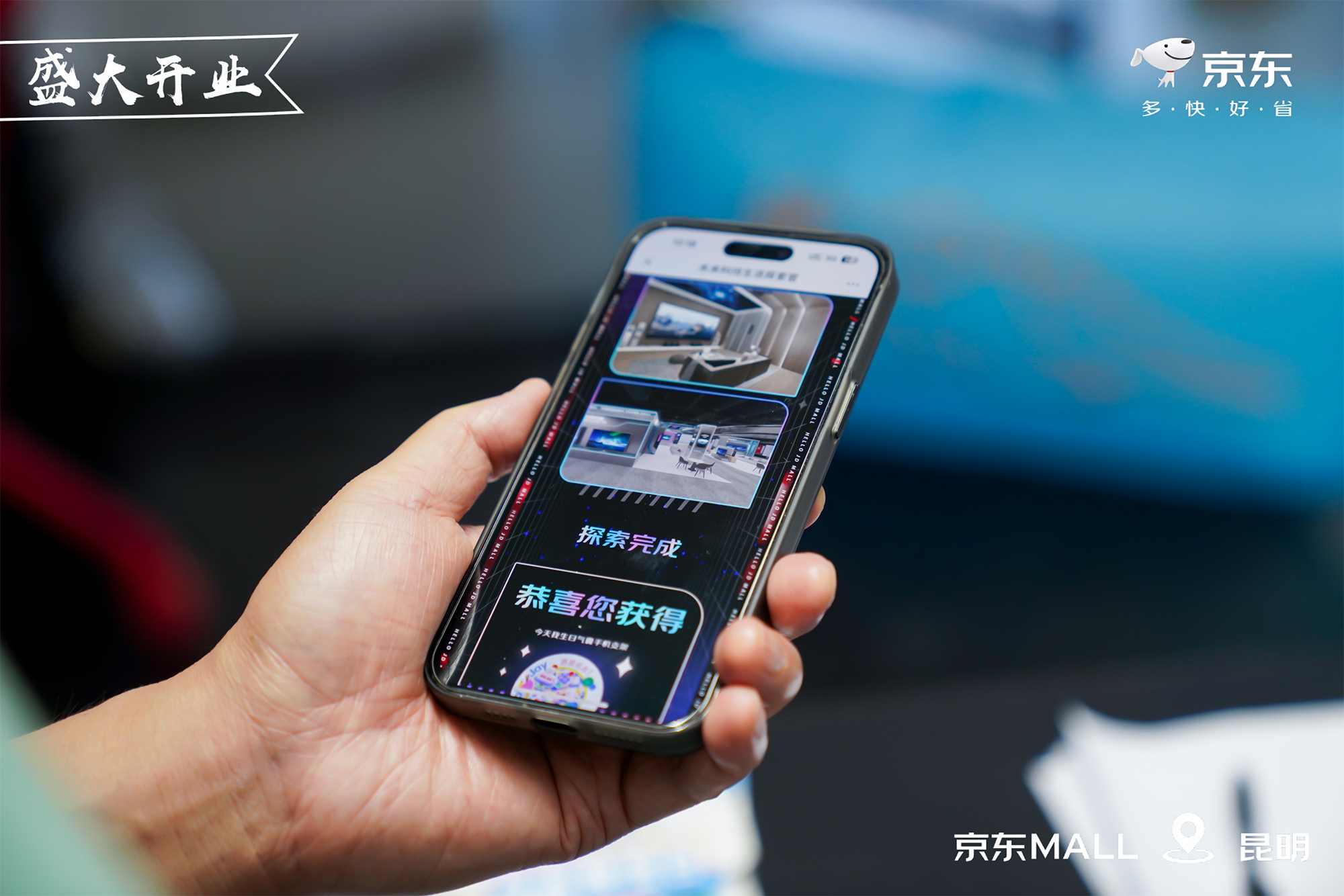昆明当地的消费者通过参与线上H5互动,即有机会成为未来科技生活探索官,不仅可以来到线下快闪活动领取昆明京东MALL城市限定购物袋、露营空气沙发、手机支架和贴纸套装、京东joy玩偶、颈枕、马克杯等丰富有趣的奖品,更有机会跟随本次活动特设的“探店地图”,在正式开业前来到昆明京东MALL完成超前探店,以科技的视角探索生活,体验超前黑科技产品,解锁未来科技新生活。