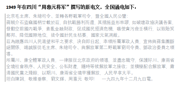 3.4 周惠元将军组织成都市附近的彭县起义(注:现在指的成都起义,实质就是指国军在成都附近的“彭县或彭州”起义)