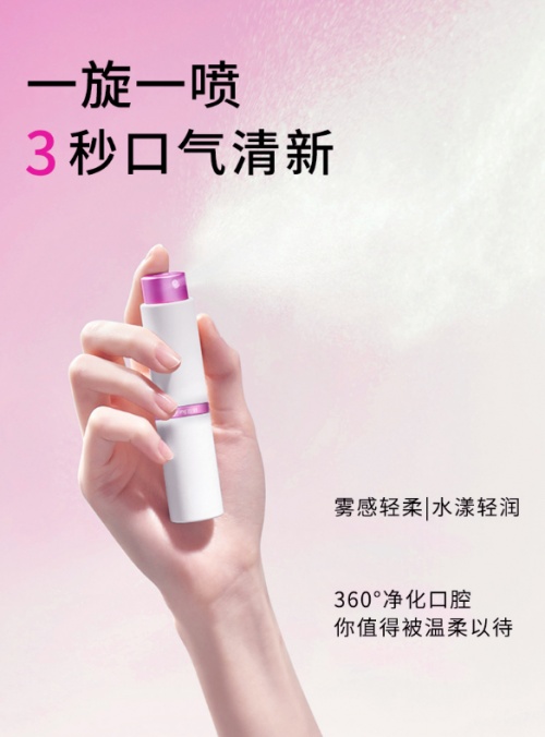为了方便消费者随时随地清新口气,冰泉HEY!DD口香喷雾设计了精致便携的包装,瓶身仅口红大小,粉白配色精致美观。其喷头可像口红管芯般旋出使用,不需使用时可以旋转闭合,便捷卫生。小巧的瓶身并不代表它不耐用,经试验测试,冰泉HEY!DD口香喷雾单支可喷100次,持久相伴。
