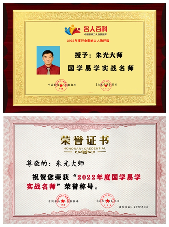 专研易道声名著弘扬国学踏征途:朱光教授主攻易经风水。他博采众长。如同涓涓细流,在中医研究、易学见解以及国学研究上业已成为一代名家。先后荣获“中国当代国学名家”、中华当代周易杰出贡献人物、“易学泰斗"中国大健康产业周易预测百杰人物、“行业影响力人物”等荣誉。个人事迹得到中央电视台、华人日报、决策中国栏目、环球人物网、人民日报网、新华在线等多家权威媒体报道刊登。朱光教授不溪初心,忠于天地人寰,顺应乾坤万物理论,他坚守初心,砥砺前行,为实现传统文化复兴做出自己积极的贡献。