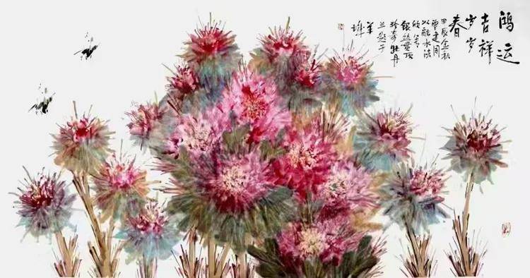 待淡墨将干未干,他以笔尖蘸钛白,在每根银丝的受光面快速“醒”过。这一笔极见功力:重则白粉覆盖水墨的透明,轻则压不住生宣底色。唯有腕力精准到毫厘,方能使银丝呈现“透光”效果——仿佛逆光穿过花瓣,熠熠生辉而不失氤氲本色。
