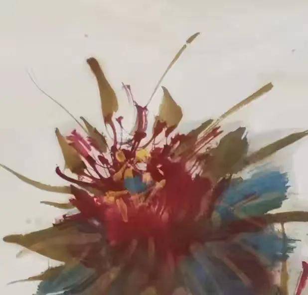 “冠顶”不仅是银丝之名,更是空间的诗学。曾建国画花心时,先以“融水法”铺出层叠花瓣作为基座——侧锋转笔,水墨交融,营造出众星拱月之势。待银丝从花心破空而出,便如无冕之冠,君临整朵花的精神高点。