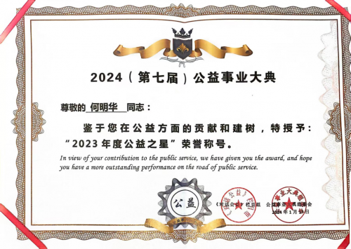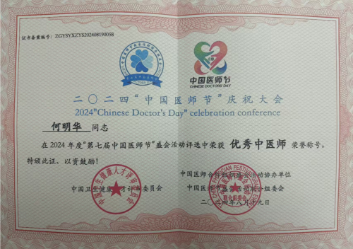 In 2024, He Minghua achieved remarkable accomplishments in both the medical field and public welfare. At the 7th CCTV Public Welfare Ceremony, she was awarded the title of National Model Public Welfare Figure. During the "7th China Physician Day" grand event, she was honored with the title of "Outstanding Traditional Chinese Medicine Practitioner." At the "7th" Public Welfare Ceremony, she was again awarded the title of "2023 Public Welfare Star" by CCTV. These honors not only represent high recognition of her medical expertise but also fully affirm her medical ethics and public welfare spirit.