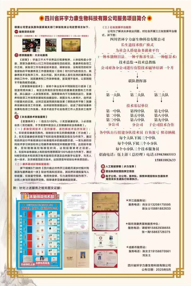 正是在这样的时代背景下,四川省环宇力康生物科技有限公司(以下简称“环宇力康生物”)以“科技赋能健康,创新引领未来”为使命,在创始人陈远宽的带领下,深耕康养技术研发领域,将前沿科技与传统养生智慧深度融合,为全球健康产业的发展开辟了新赛道。