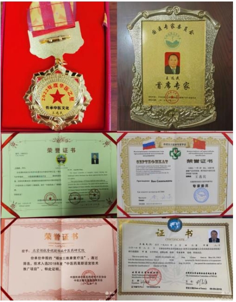 他本人先后获得"当代华佗","中华特色医疗名医","当代 中国百佳中医特效名医","中国民间优秀名中医", "中华特 色骨科名医","张仲景医圣奖"(祖国传统医学与中医微创学 领域) ,入编《中国专家大辞典》被授予"中国医学专家"称 号 ,入编《中国中医名医名科名院品牌博览》大型丛书,被 授予" 中华名中医"称号等。参加中国故事全球巡展委员会组 织的【中医智慧,世界共享】优秀中医传承人献礼70周年全球巡展活动,并被推选为第一站美国站巡展嘉宾,2019年10月1 日~ 7日在美国纽约时代广场纳斯达克大屏展播。